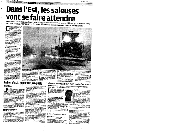 Les coupes budgétaires au sein de ce ministère sont en passe d’avoir des conséquences sur la sécurité des personnes. L’exemple du non-déneigement d’une voie sur deux, déjà programmé par la DIR Est, est éloquent.<emb2078