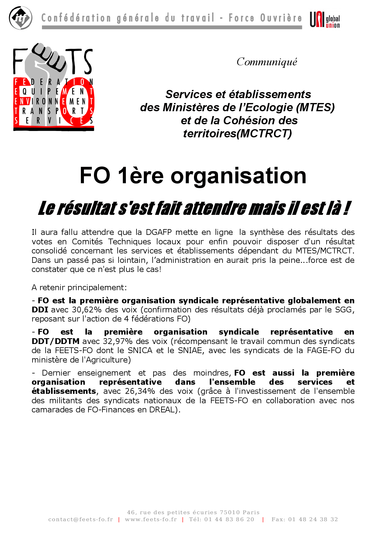 FO 1ère organisation dans les services et établissements des MTES-MCTRCT