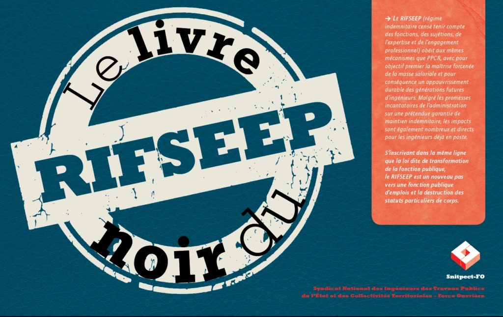 Le SNITPECT-FO rappelle son combat constant contre le RIFSEEP : individualisation des rémunérations, gestion opaque, frein à la mobilité, impossibilité de valorisation des carrières de spécialistes et d’experts, appauvrissement des générations futures, générateurs d’inégalités entre les femmes et les hommes, …